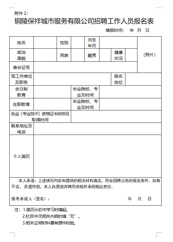 附件2:銅陵保祥城市服務(wù)有限公司招聘工作人員報(bào)名表